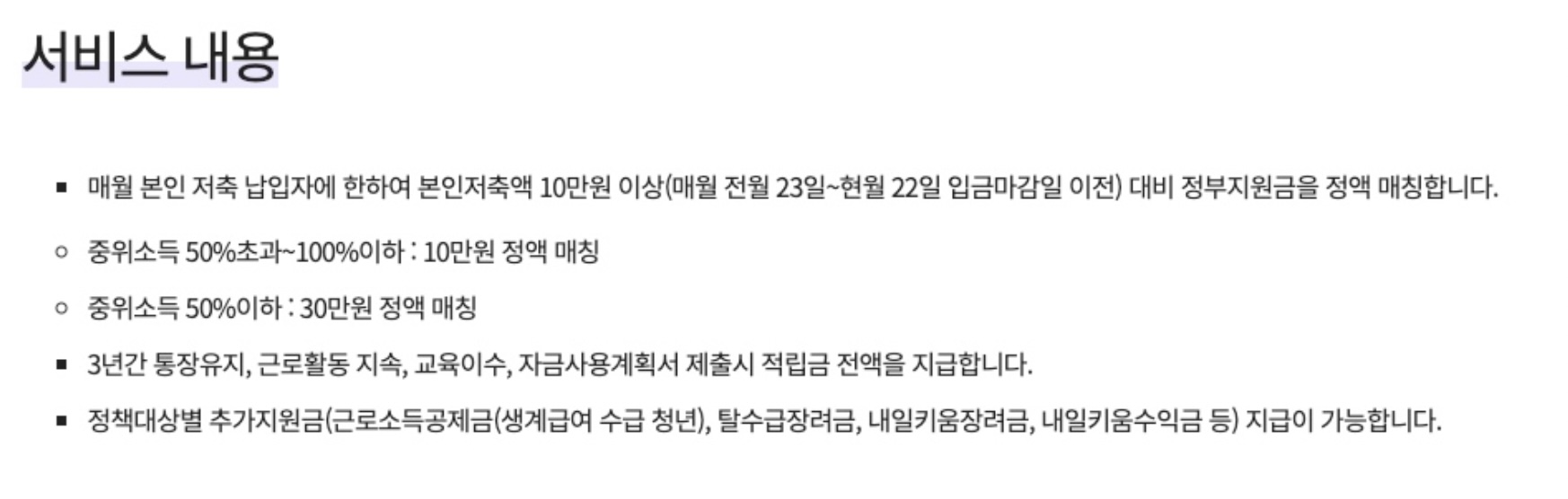 중위소득 50% 초과의 경우 10만 원 저축하면 정부에서 10만 원 추가로 지급