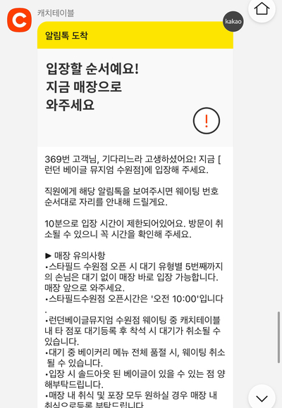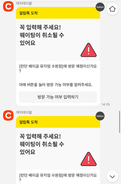 웨이팅 취소 경고 카톡도 오니까 주의하세요.