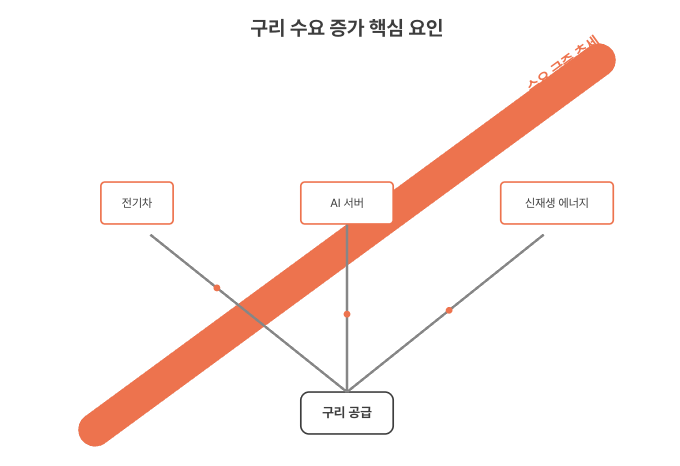 구리는 전기차, AI, 에너지 전환 같은 미래 산업에 꼭 필요한 재료라서 수요가 폭발적으로 늘고 있대.