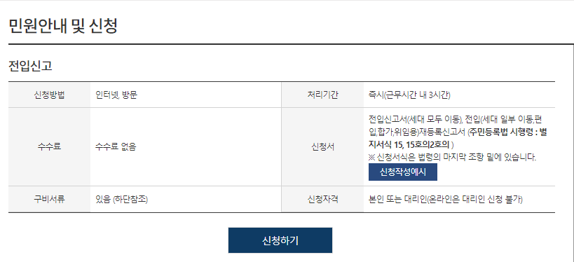 전입신고 전입신고 정보 신청방법, 처리기간, 수수료, 신청서, 구비서류, 신청자격 정보 제공 신청방법 인터넷, 방문 처리기간 즉시(근무시간 내 3시간) 수수료 수수료 없음 신청서 전입신고서(